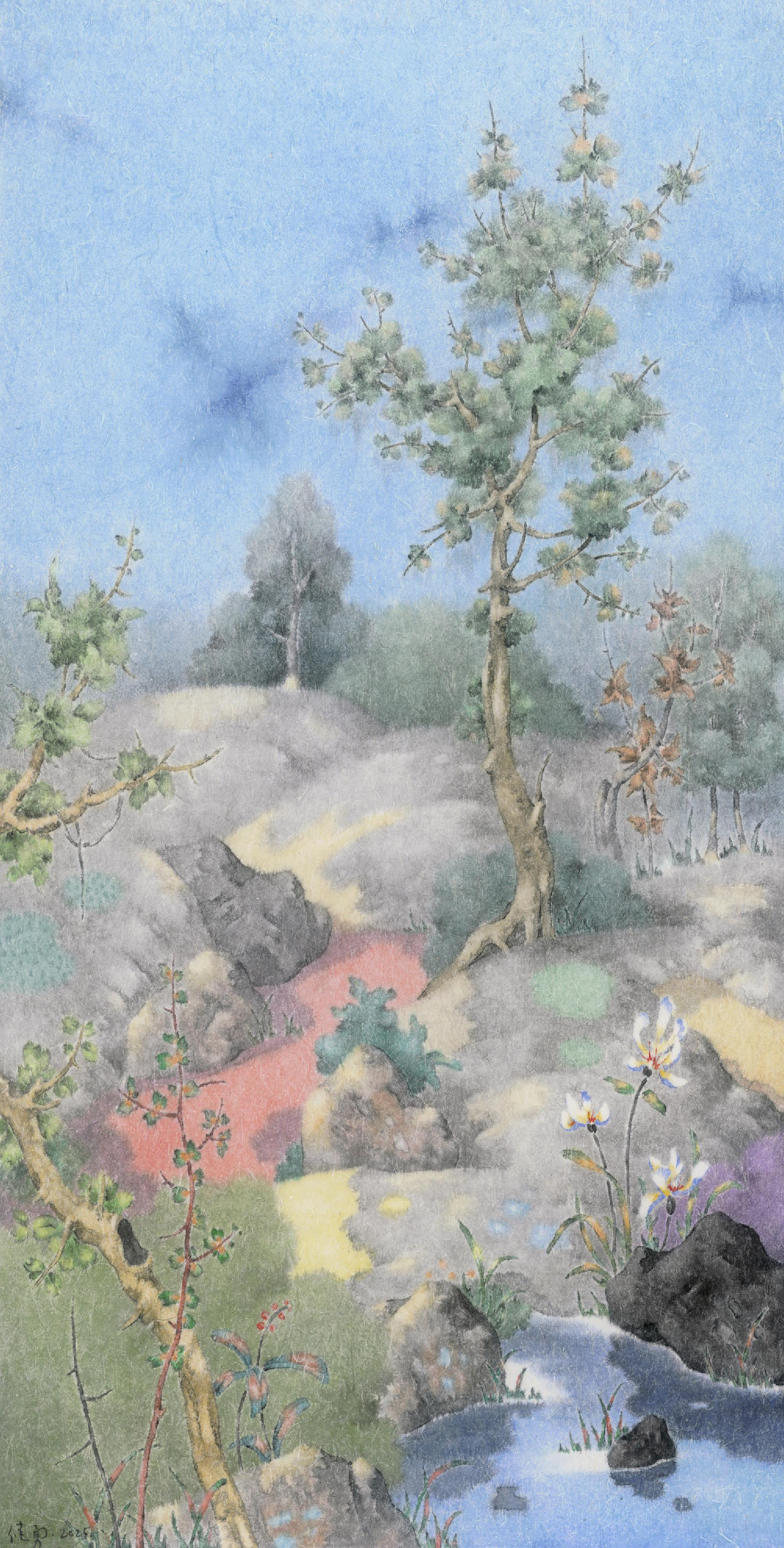 观曾健勇的山水画,“以色当墨”是其最具辨识度的艺术特色。不同于传统水墨的浓淡枯湿,他以色彩为笔、代墨而行,让画面自带温润透明的质感,褪去了传统山水的厚重沉郁,多了一份清透雅致的现代气息,每一笔色彩的晕染、每一处层次的叠加,都彰显着强烈的现代审美,打破了人们对传统山水的固有认知。